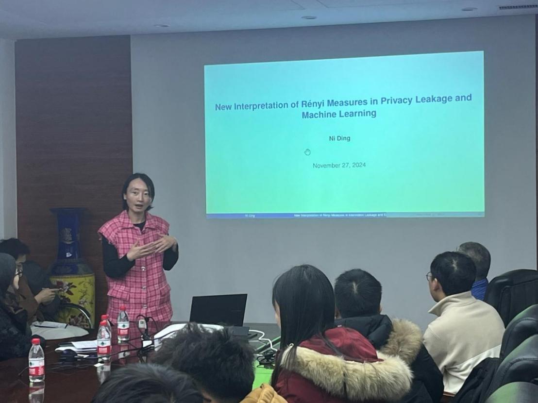 2024年11月27日,奥克兰大学丁妮博士应55直播-美女直播 邀请,在中心教学楼举分别作题为“隐私泄露与机器学习中的Rényi度量新解释”、“通过Kantorovich最优传输计划实现ε-Pufferfish隐私”的学术讲座,,讲座分别由55直播 礼欣老师、胡晶晶老师主持,语言智能与社会计算研究所和网络攻防对抗研究所相关专业方向师生参加了讲座。