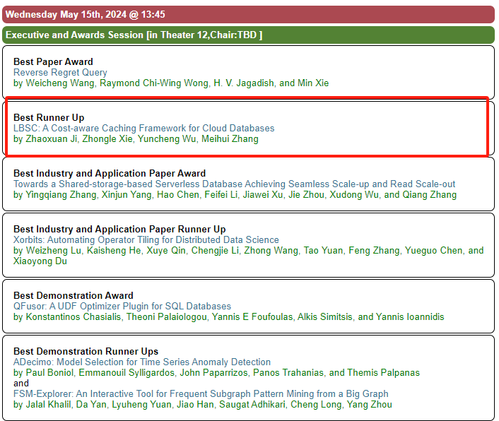 获奖论文题目为《LBSC: A Cost-aware Caching Framework for Cloud Databases》。现有云数据库通常采用存储-计算分离(storage-aggregation)架构,通过在计算节点设置缓存来降低查询延迟。然而,这些缓存算法并不适用于云数据库,主要因为它们无法适应动态变化的工作负载,并且未考虑数据获取的时间成本。现有研究提出了基于机器学习的方法来适应动态负载变化,将学习模型与成本感知的缓存算法结合来解决该问题。然而,在这种场景下,Belady算法并非最优,无法有效指导学习模型,且使用学习模型会引入显著的计算开销,甚至可能恶化云数据库的性能。针对上述问题,课题组提出了一个基于学习、成本感知的高性能缓存框架LBSC。该框架提出了一种近似最优的算法BeladySizeCost,将高获取成本且可能在不久将被访问的数据项保留在缓存中。同时,设计了一个轻量级学习模型来模拟BeladySizeCost的行为,以预测待驱逐的缓存数据。LBSC还设计了多种优化措施,以减少学习模型的计算开销,从而提升整体性能。